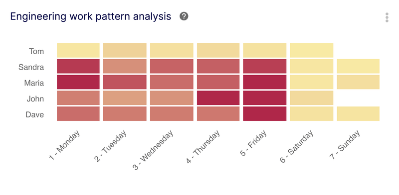 Measures the number of commits per user per day of the week with the Engineering Work Pattern Analysis Metric.