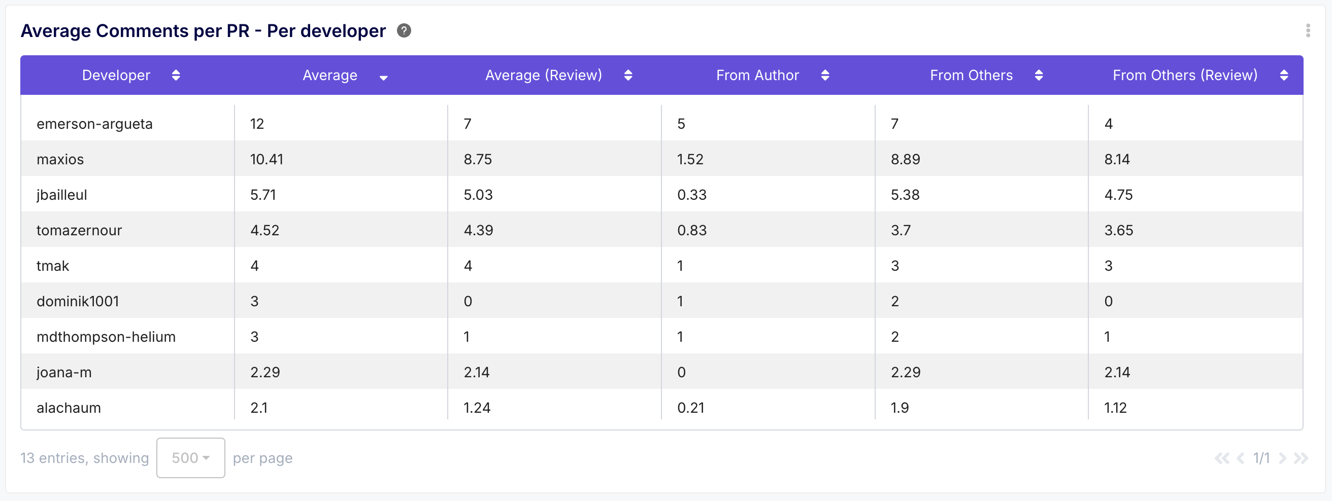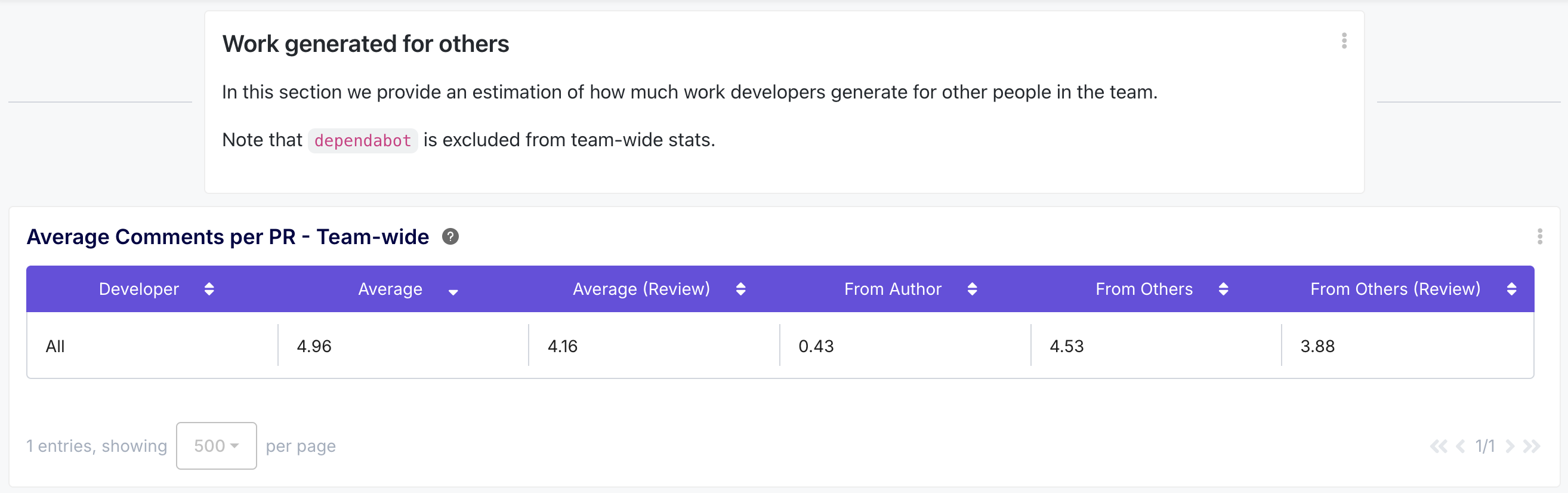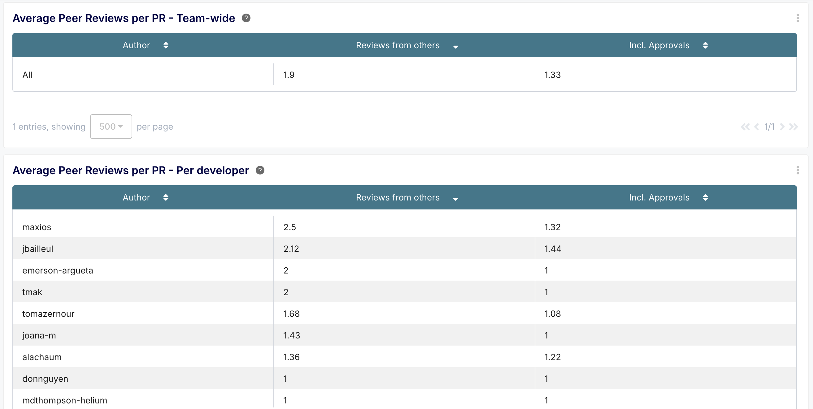 - What you get: Metrics on the average number of peer reviews and comments PRs receive, both team-wide and per developer, including breakdowns by author vs. others.